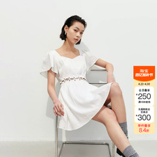 绫致ONLY25冬新法式波浪半袖腰部镂空设计心形领口短袖连衣裙女